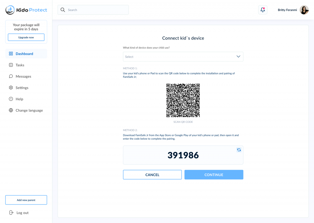 بعد ملء الحقول، انقر فوق “متابعة” للحصول على رمز الاستجابة السريعة. المسح على جهاز طفلك.