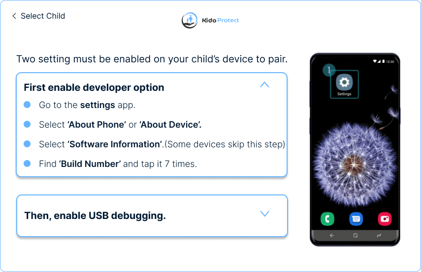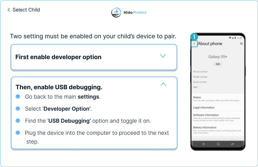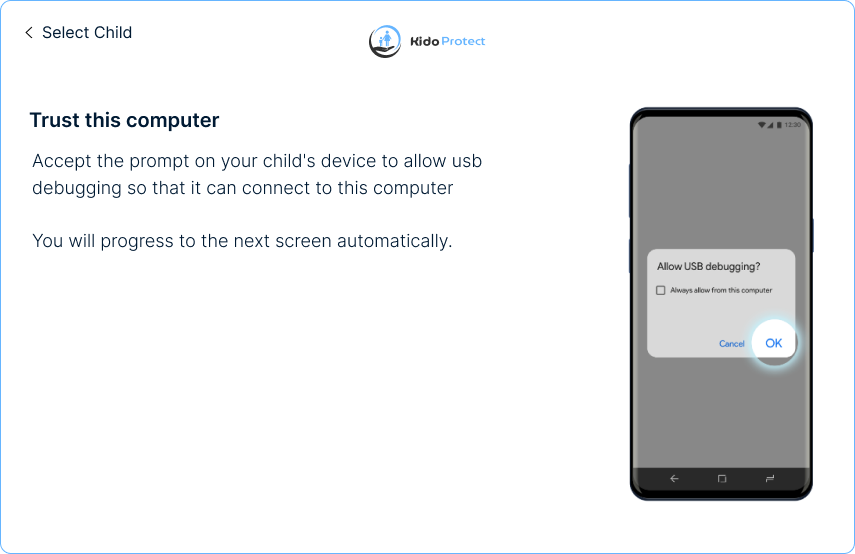 قم بتمكين تصحيح أخطاء USB واقبل المطالبة على جهاز طفلك. بمجرد التمكين، قم بتوصيل جهاز طفلك بالكمبيوتر باستخدام كابل USB.