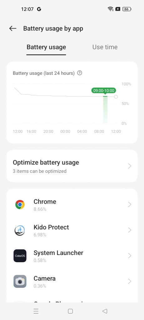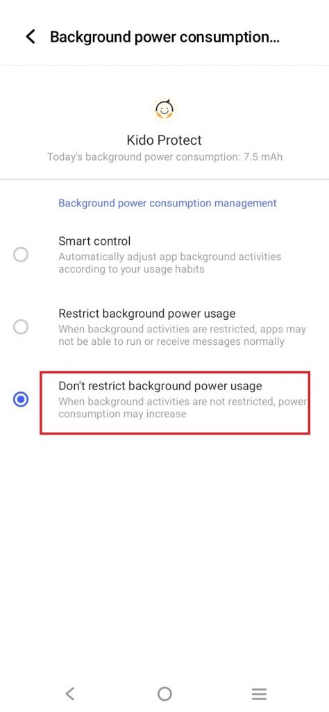 اضغط على “استخدام البطارية حسب التطبيق”، وابحث عن تطبيق كيدو بروتكت، وحدده.