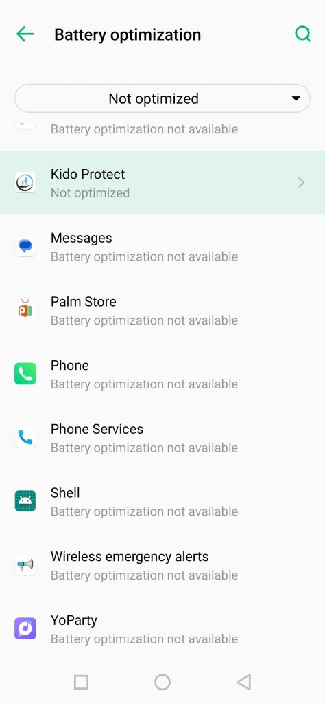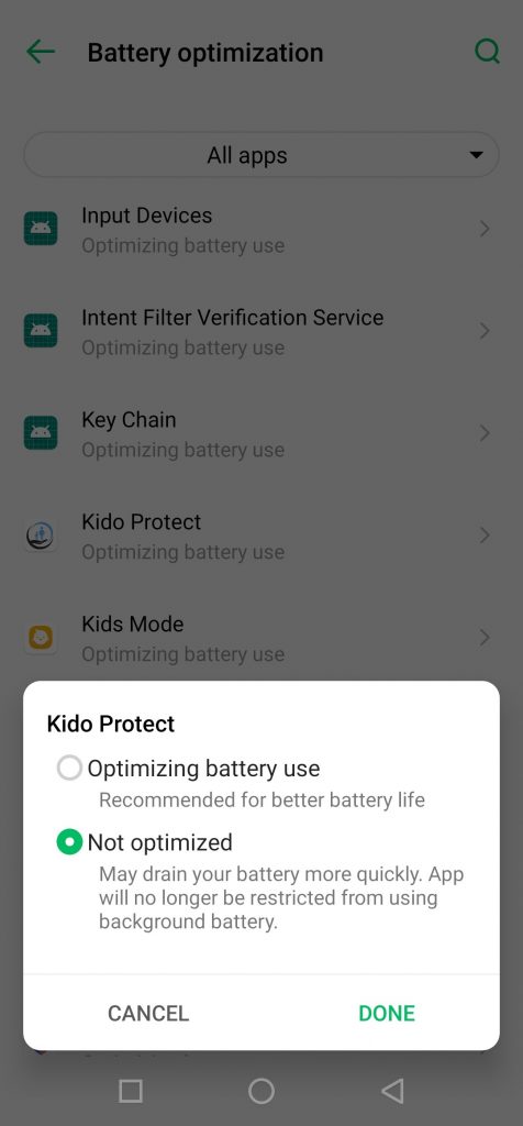 انقر على تطبيق كيدو بروتكت وقم بتغيير الإعداد من تحسين استخدام البطارية إلى عدم التحسين.