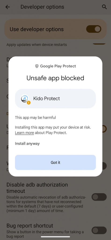 بمجرد الانتهاء من تثبيت تطبيق KidoProtect ولم تعد بحاجة إلى تصحيح أخطاء USB، يجب عليك تعطيل هذه الميزة إلى جانب خيارات المطورين الأخرى. للقيام بذلك، قم بإيقاف تشغيل تبديل خيارات المطور في قائمة الإعدادات.
